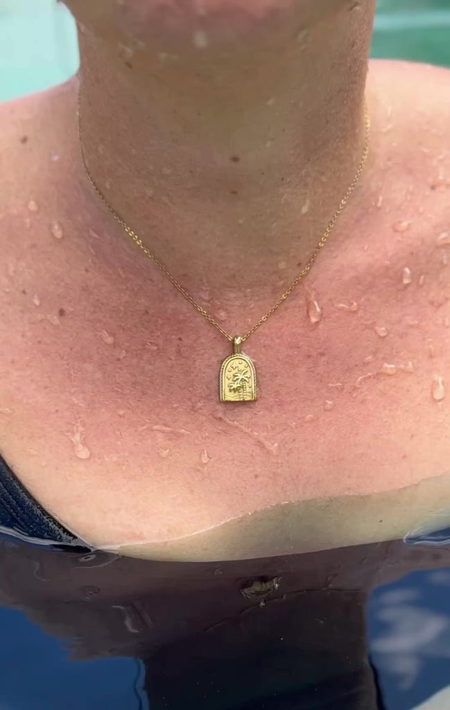 This elegant necklace features a beautifully designed gold pendant on a delicate chain. The pendant showcases a raised palm tree motif with a celestial background of stars, with one star featuring a beautiful zirconia stone, adding a tropical and dreamy touch.